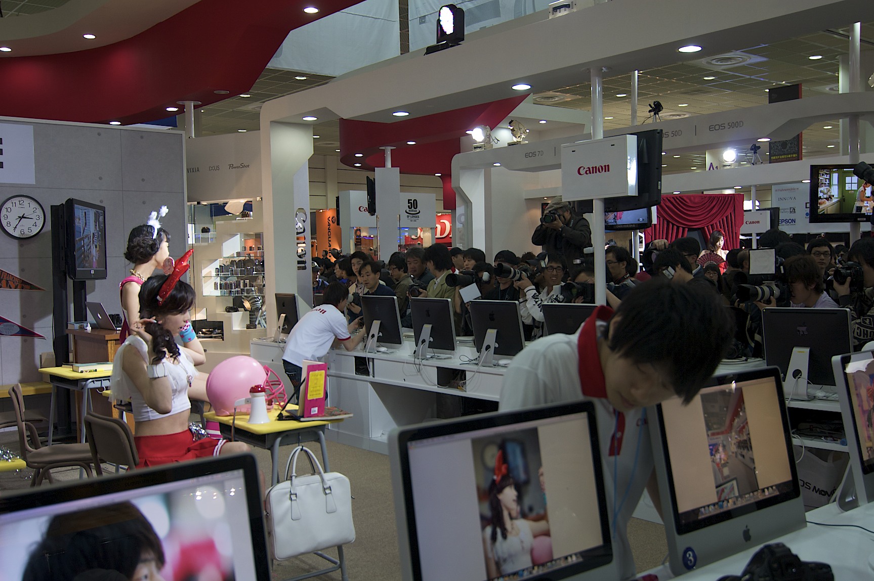 Canon was rocking the “school girl” theme and positioned their expensive products around two models and a classroom setting. It was interesting for me because I have never actually seen this type of set up outside of car shows in Korea. However, if you are a portrait photographer that doesn’t want to hire a model… this might be a cost effective way to boost your portfolio.
