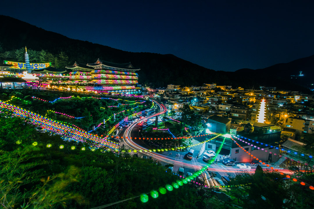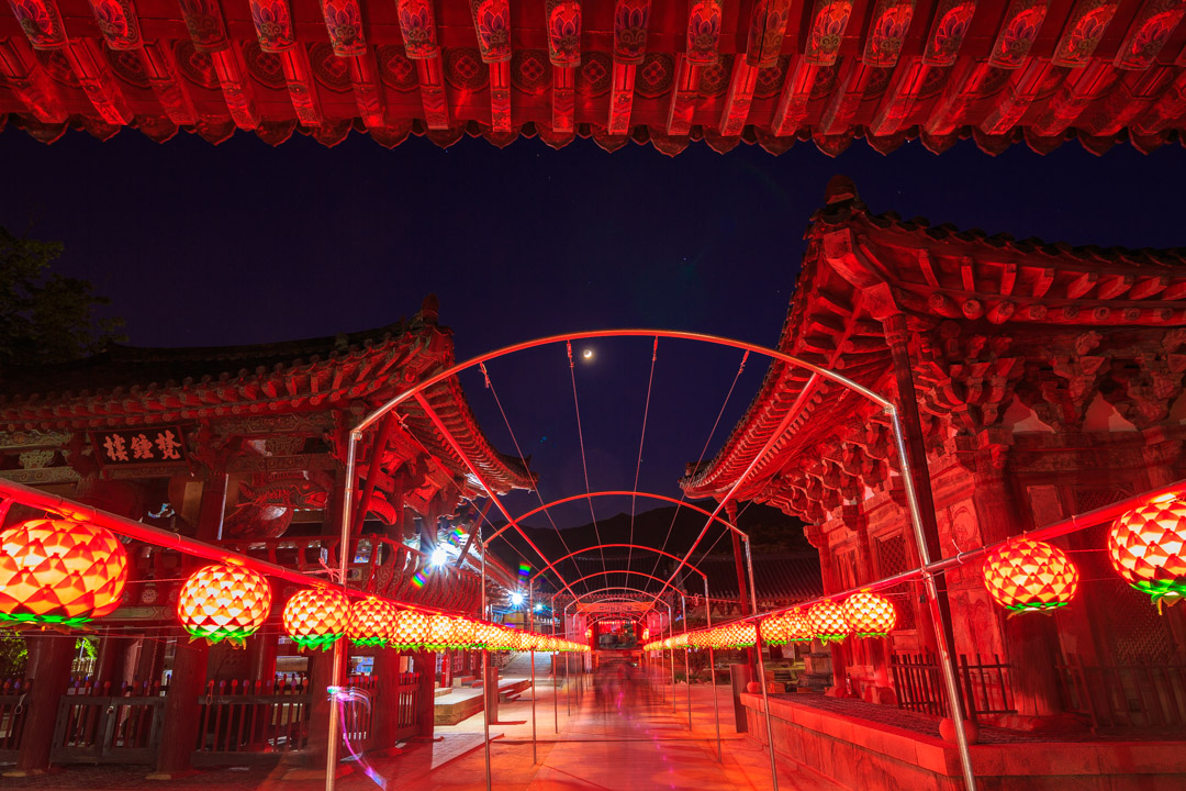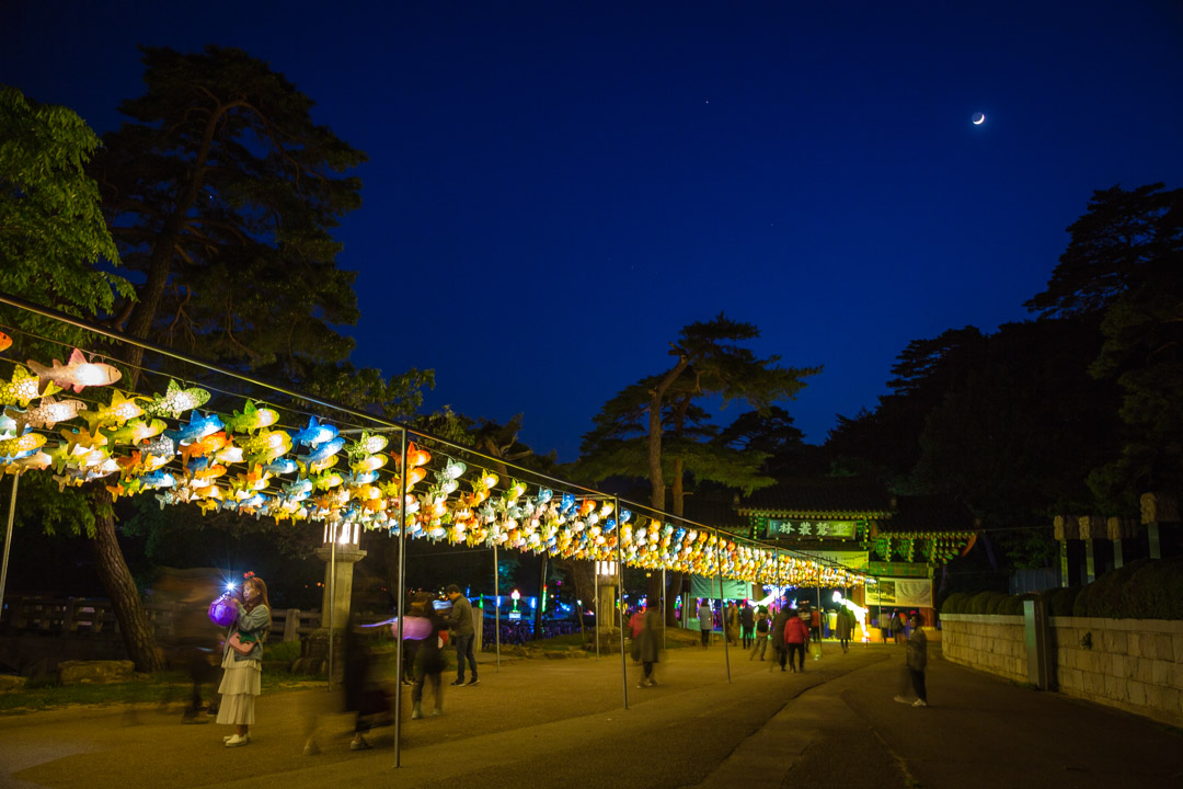 I sat on a bench sipping a coffee and then it hit me. I was missing something here. Sure there were a lot of pretty lanterns but I couldn’t really tell the story that I wanted to at this location. I had to go elsewhere. So I went out to Tongdosa the next chance that I could. That is where I got a better idea of what I wanted to achieve from these shots. I walked in from the front gate where the parade was being assembled. I knew they going to walk with the lanterns down the path to the temple. My brain was constantly pointing out places to shoot from. I walked to the temple and back before I had a better idea. Then I got into position and waited.