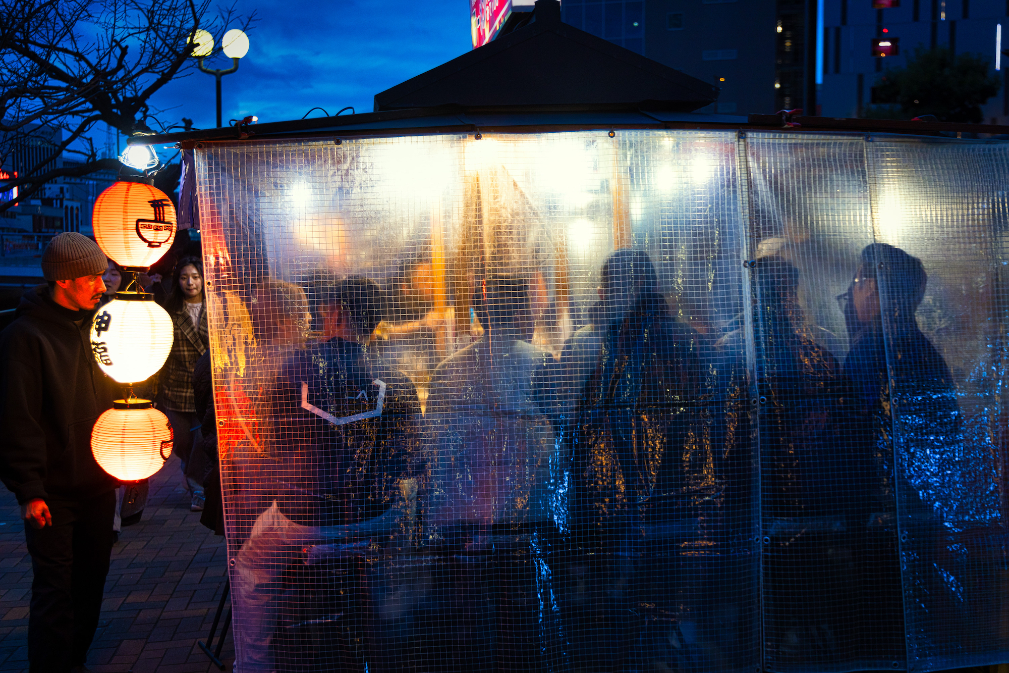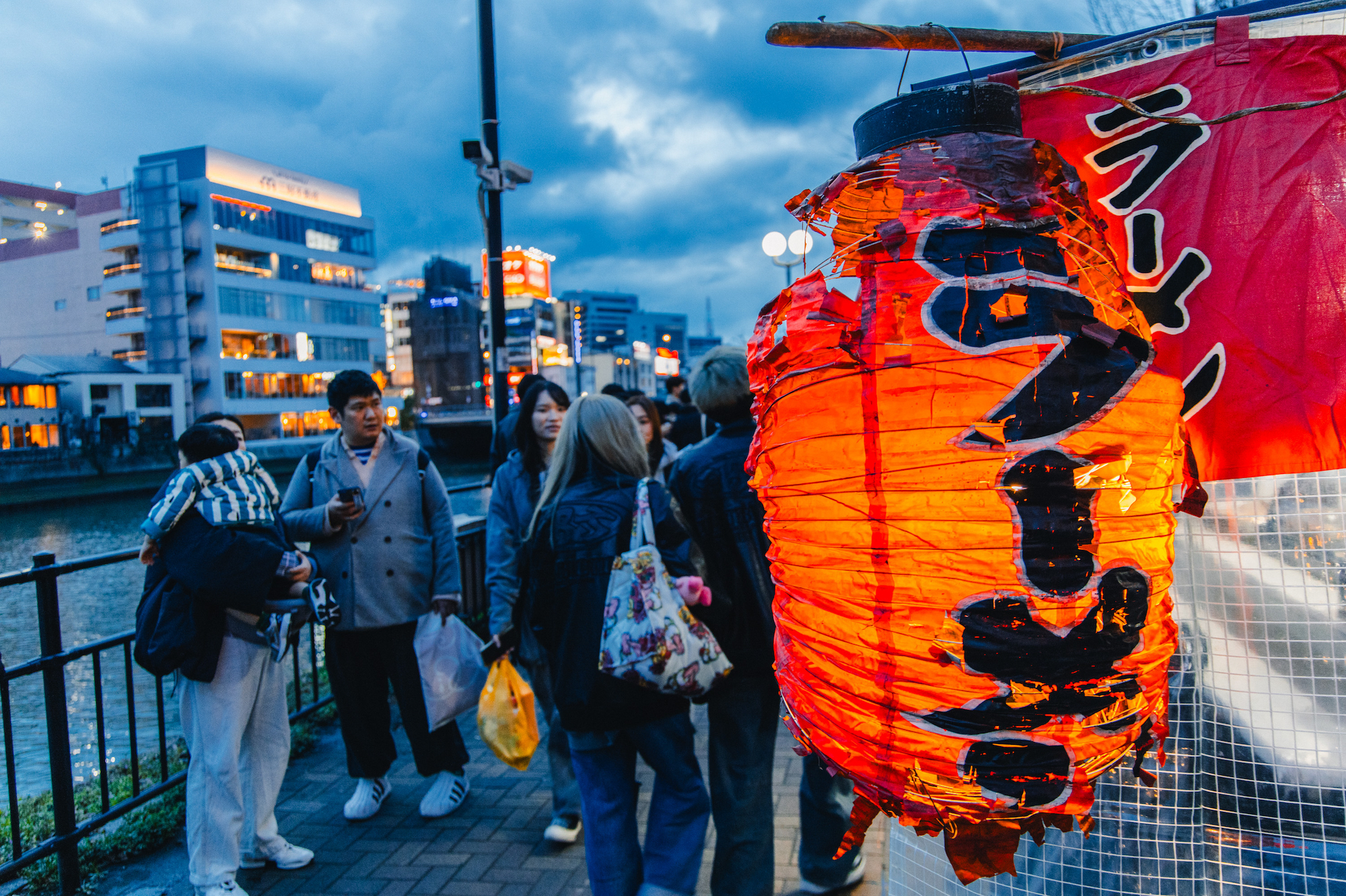 Evening. The angles change, the city breathes differently. My legs screamed, my joints ached but I wasn’t done. Nakasu Yatai Street—this is where Fukuoka really comes alive at night. A long row of food stalls, lanterns glowing, the air thick with grilled skewers, booze and the hum of conversation.